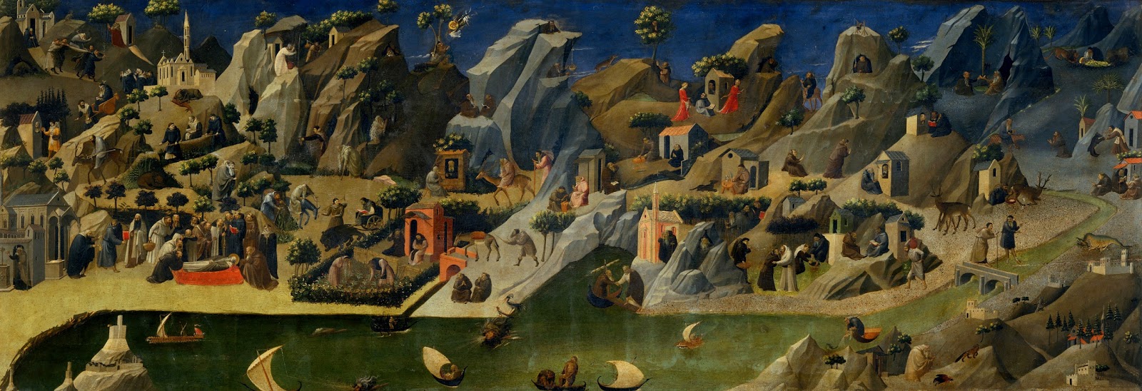 E sebbene in questa tavola la necessità imposta di esemplarsi sul grande cartellone eremitico di Pisa, a sua volta desunto da qualche schema bizantino, non permettesse all'artista di unificar prospetticamente tutto il racconto (che non esiste la sintesi di un calendario o di un elenco, a meno di sopprimerlo), ch'egli sapesse tuttavia di spazio assai più di quanto a prima vista non possa mostrarci è facile indurre solo che si isoli ogni episodio: per citarne il più complesso, quello del lamento sull'eremita morto [sotto].